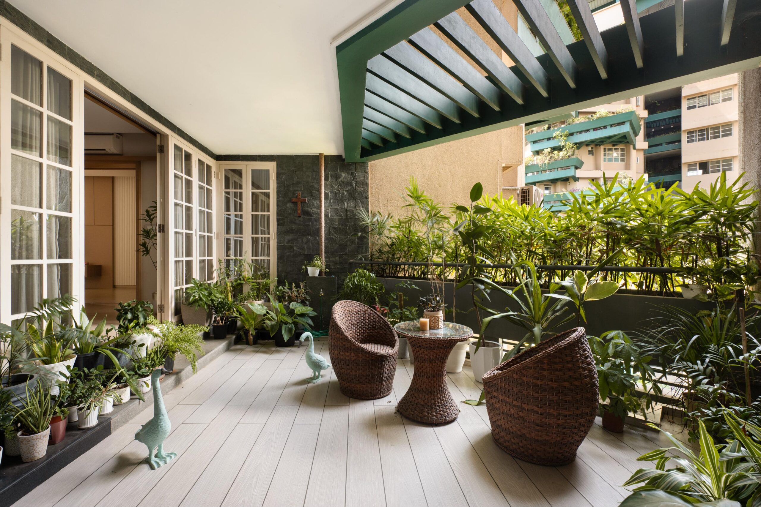 When you step into this residence, it is hard to believe you are on the 8th floor of an apartment tower. The moment you exit the lift, you are welcomed by a lush garden balcony—a green threshold that instantly breaks the typical apartment experience and gives the sense of entering a villa-style home in the sky. The entrance itself is striking: a **French window–cum–door, elevated two steps above the lobby level, lending an architectural character that is rarely seen in high-rise living. From this very first impression, the design sets the tone of exclusivity, warmth, and a feeling of retreat.